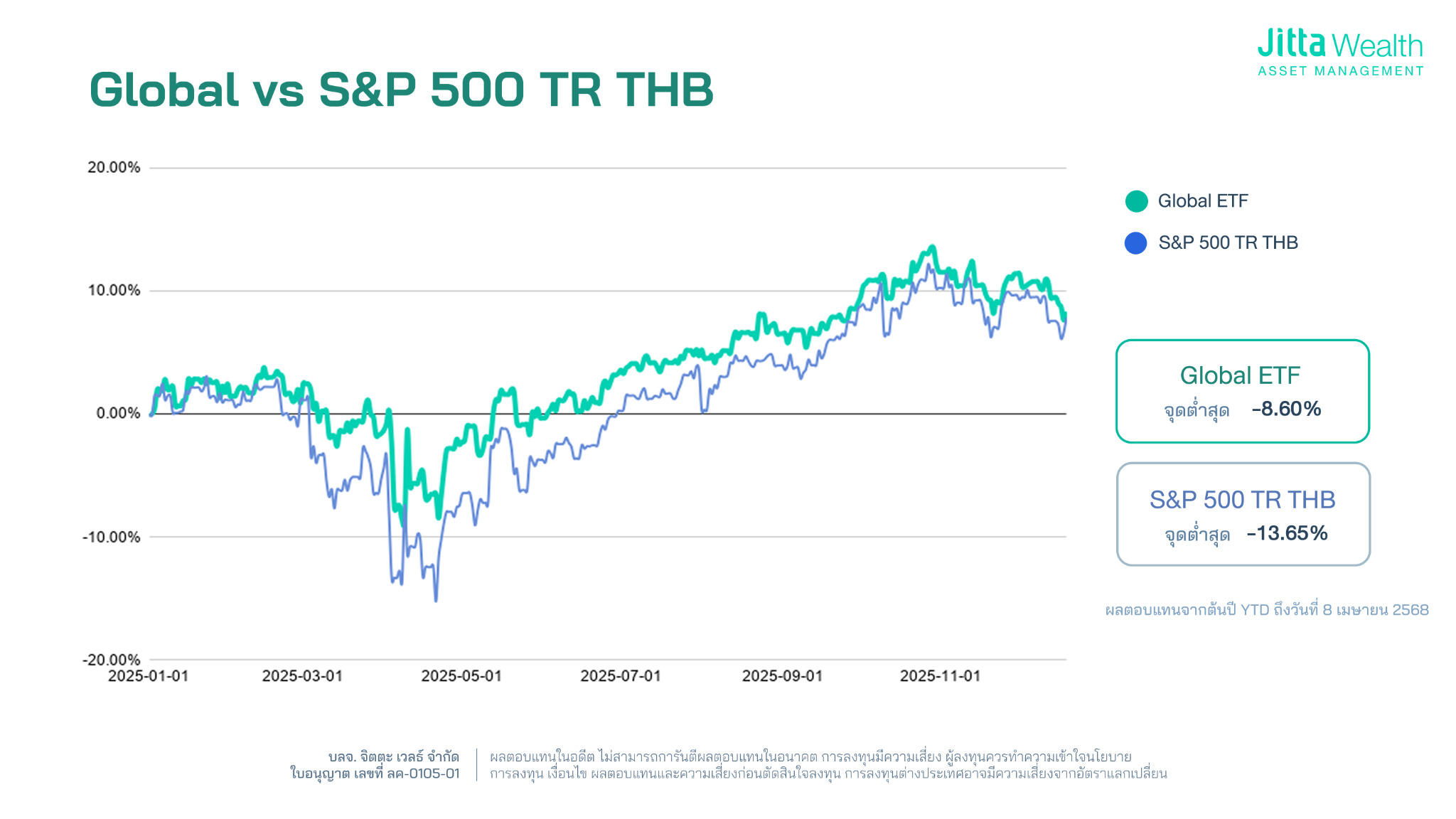 ปีที่ผ่านมาการจัดพอร์ตแบบ Core & Satellite พิสูจน์ได้ว่าช่วยลดผลกระทบจากตลาดที่ผันผวนรุนแรงได้เป็นอย่างดี จากหลักของการกระจายความเสี่ยง เช่น ในช่วง Liberation Day ที่ตลาดตกแรง พอร์ต Global ETF นั้นติดลบเพียง -8.60% เทียบกับ S&P 500 ที่ติดลบ -13.65%