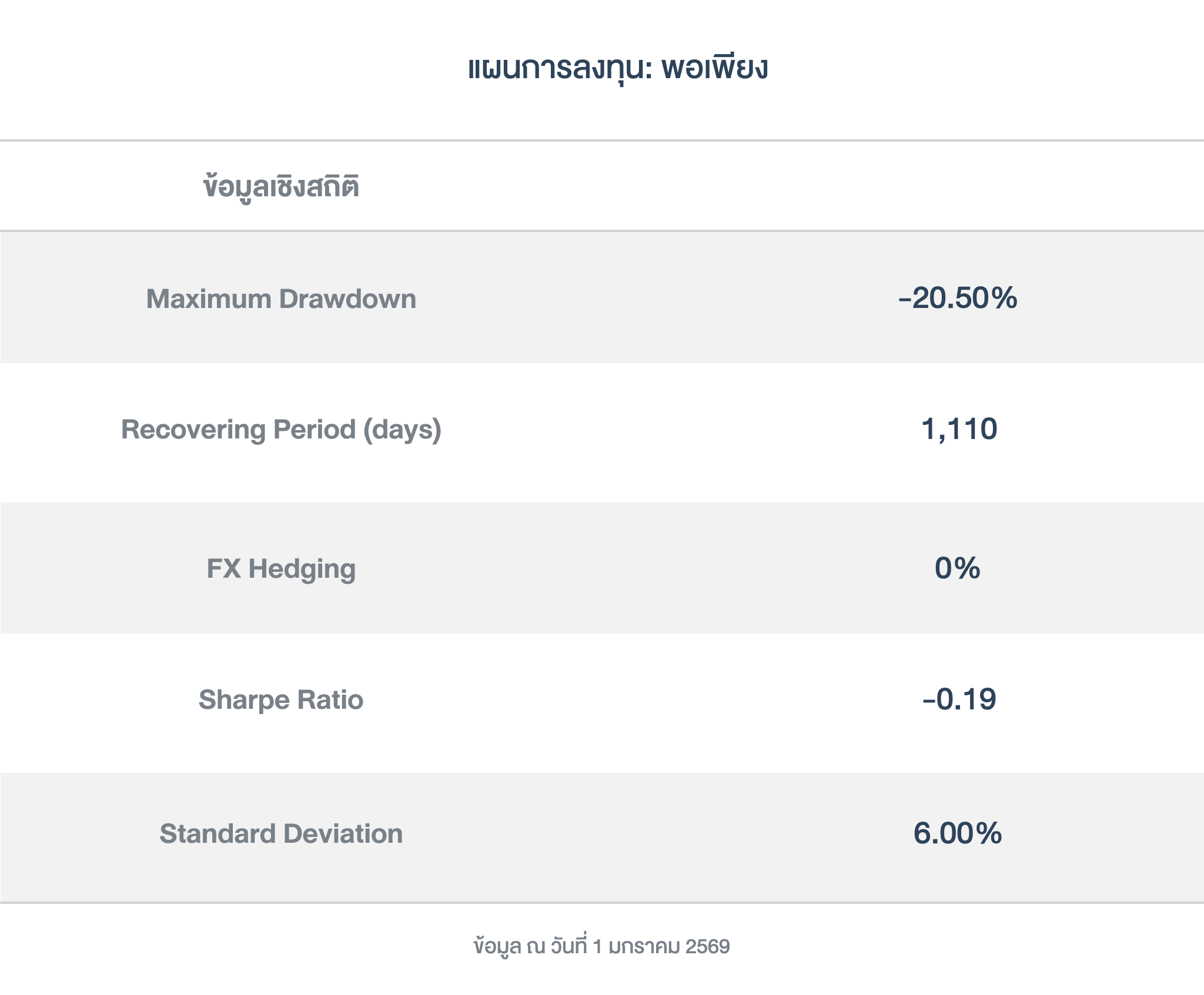 - เหมาะกับ นักลงทุนที่มีระยะเวลาลงทุนปานกลางถึงยาว และต้องการพอร์ตที่สมดุลระหว่างผลตอบแทนและความเสี่ยง