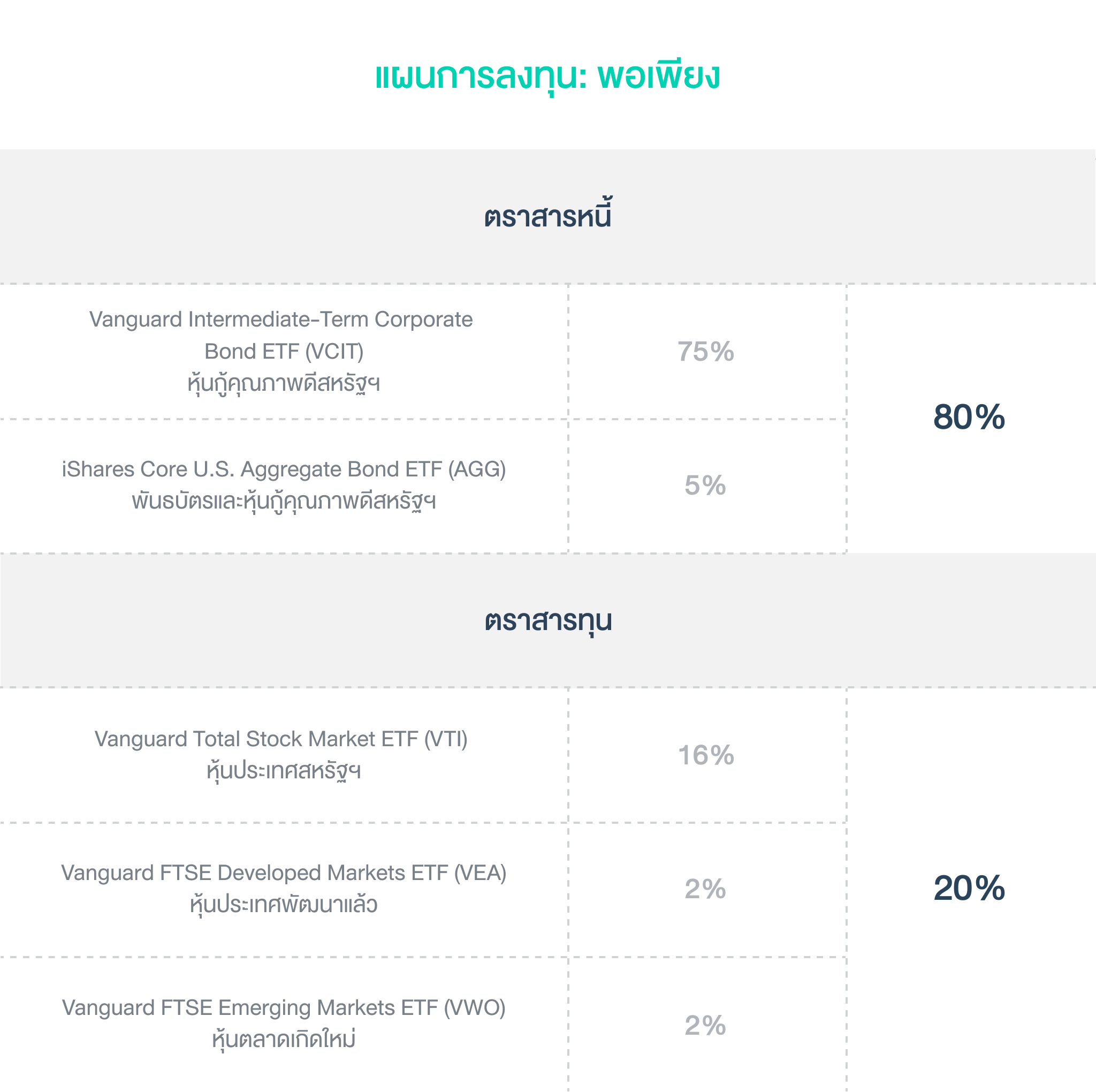การจัดสัดส่วนของกองทุน ETF จะใช้แนวคิดตาม Modern Portfolio Theory ไม่ว่าจะเป็นแผนพอเพียง สมดุล หรือเติบโต ในพอร์ตจะประกอบไปด้วยสินทรัพย์ 2 ประเภท ที่ไม่ค่อยสัมพันธ์กัน ได้แก่หุ้น และตราสารหนี้ ทำให้ความผันผวนของพอร์ตโดยรวมลดลง แต่ยังรักษาผลตอบแทนคาดหวังได้ใกล้เคียงเดิม