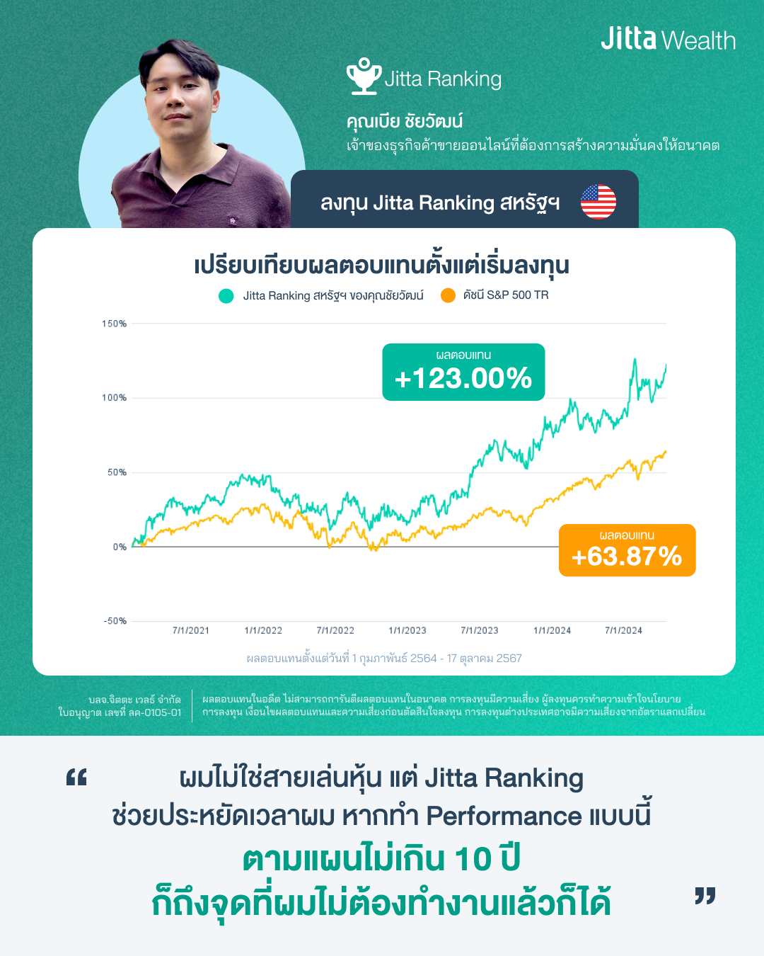 เพราะความแน่นอนคือความไม่แน่นอน การเตรียมตัวเพื่ออนาคตที่มั่นคง เป็นเรื่องที่ทุกคนทุกอาชีพต้องวางแผนการเงินของตัวเองให้ดีและเดินตามเส้นทางที่วาดไว้ เช่นเดียวกับคุณเบีย ชัยวัฒน์ เจ้าของบริษัท Loyally Active ธุรกิจค้าออนไลน์บนเว็ปไซต์ amazon.com ที่ได้เตรียมสร้างพอร์ตการลงทุนของตัวเองให้แข็งแรง เพียงพอที่จะรองรับอนาคตในวันนึงที่ธุรกิจของตัวเองอาจจะต้องเลิกรา ด้วยการลงทุนใน Jitta Ranking หุ้นสหรัฐฯ จนสร้างผลตอบแทนได้ถึง +123% (วันที่ 1 ก.พ. 2564-17 ต.ค. 2567) เอาชนะดัชนี S&P500 ในช่วงเวลาเดียวกันที่ทำได้ +63.87%
